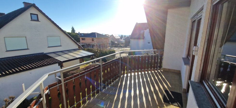 Das angrenzende Wohn- und Esszimmer ist mit hellem Laminat ausgelegt und wirkt durch die großzügige Verglasung zur Ostseite angenehm hell. Von hier aus gelangen Sie direkt auf den überdachten Ostbalkon – in dieser ruhigen Lage ein optimaler Ort zum Entspannen und Runterkommen.