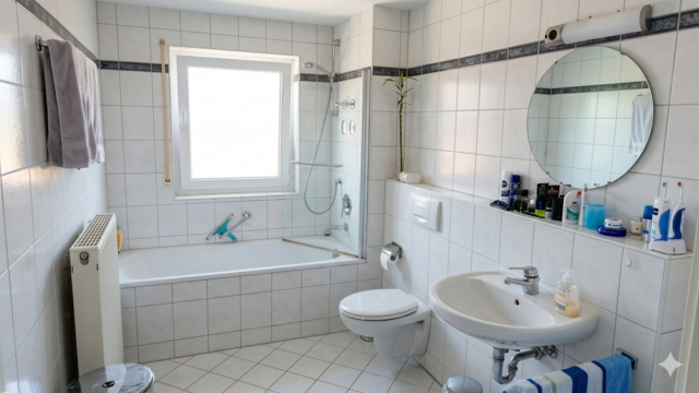 Das helle Tageslichtbad ist modern gefliest und mit einer Badewanne samt Duschvorrichtung, einem Waschtisch sowie einem WC ausgestattet.