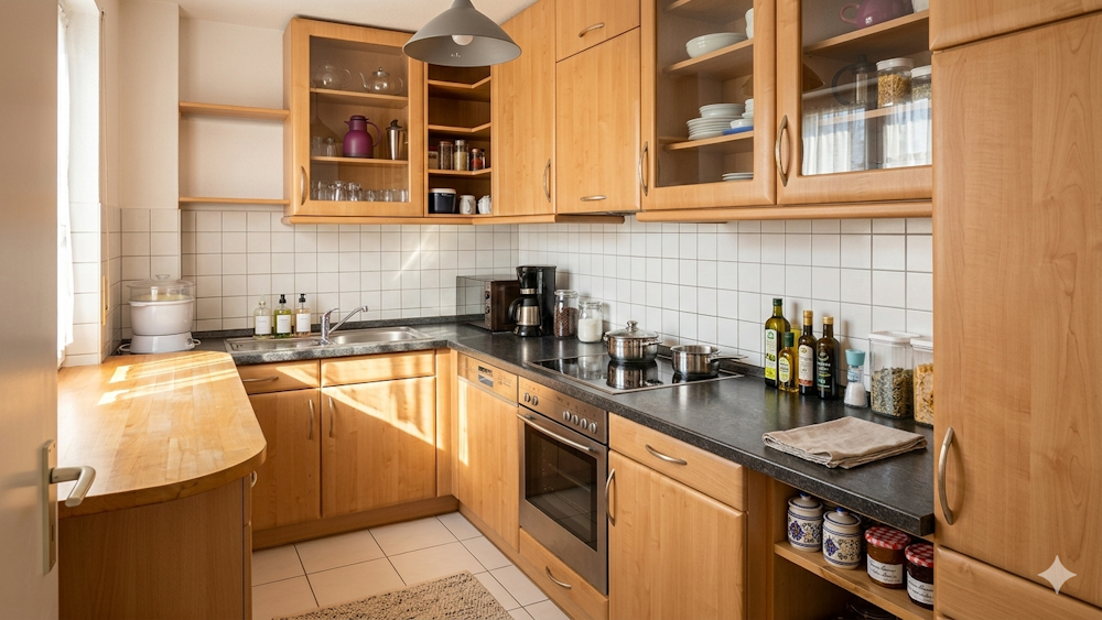 Die separate Küche verfügt über eine vollständige Einbauküche inklusive Spülmaschine. Die Elektrogeräte werden dem Mieter zur Nutzung überlassen, ohne Garantie- oder Gewährleistungsanspruch gegenüber dem Vermieter.