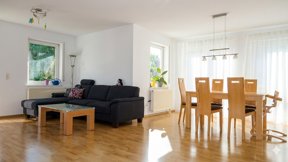 Das großzügige, offen gestaltete Wohn- und Esszimmer besticht durch bodentiefe Fensterelemente, die für eine helle und freundliche Wohnatmosphäre sorgen. In Wohn- und Schlafräumen ist ein hochwertiger, heller Laminatboden verlegt, der den modernen Charakter der Wohnung unterstreicht.